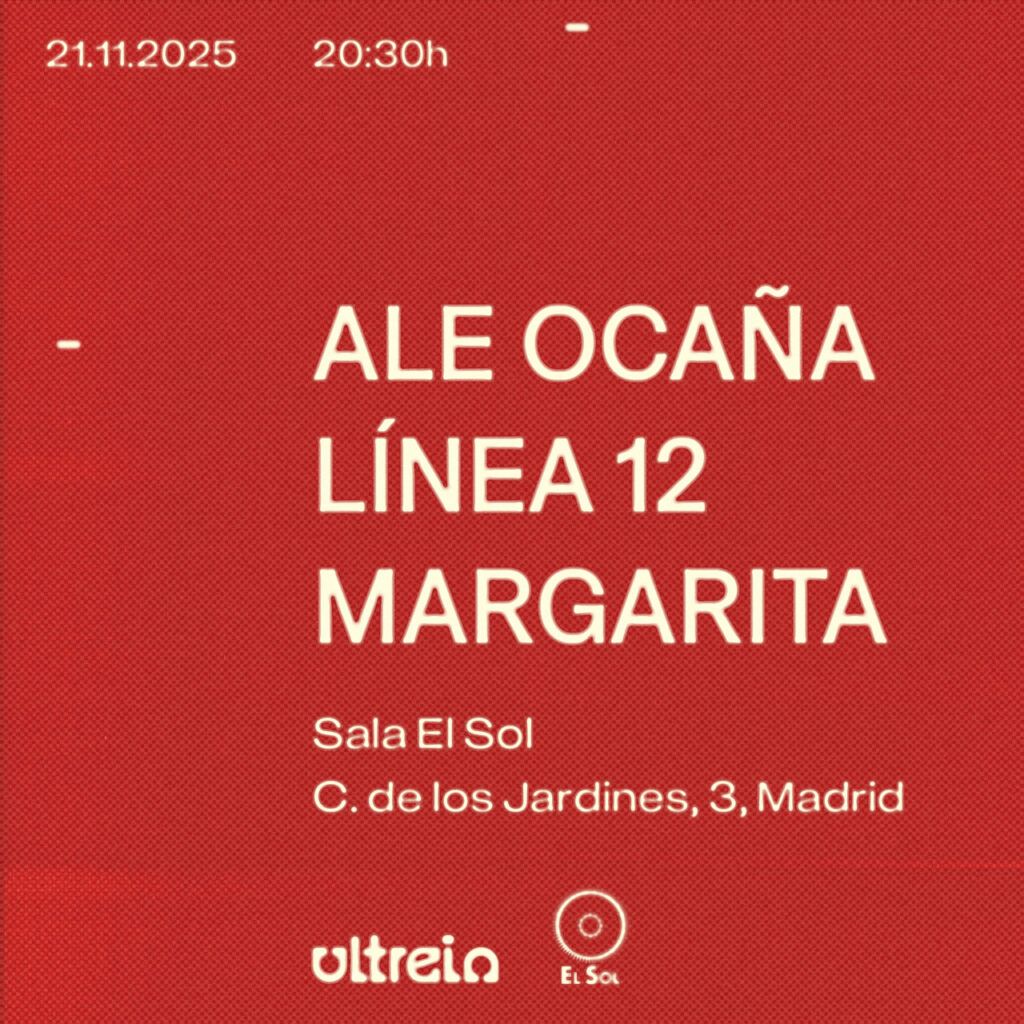 viernes 21 noviembre @ 20:30 – 23:30 – Ale Ocaña, Línea 12 y Margarita, en un mismo lugar y en un mismo día. El próximo viernes, 21 de noviembre de 2025, en la mítica Sala El Sol de Madrid estos 3 artistas emergentes se darán cita de la mano de Ultreia, posicionando el talento madrileño en el lugar que se merece.