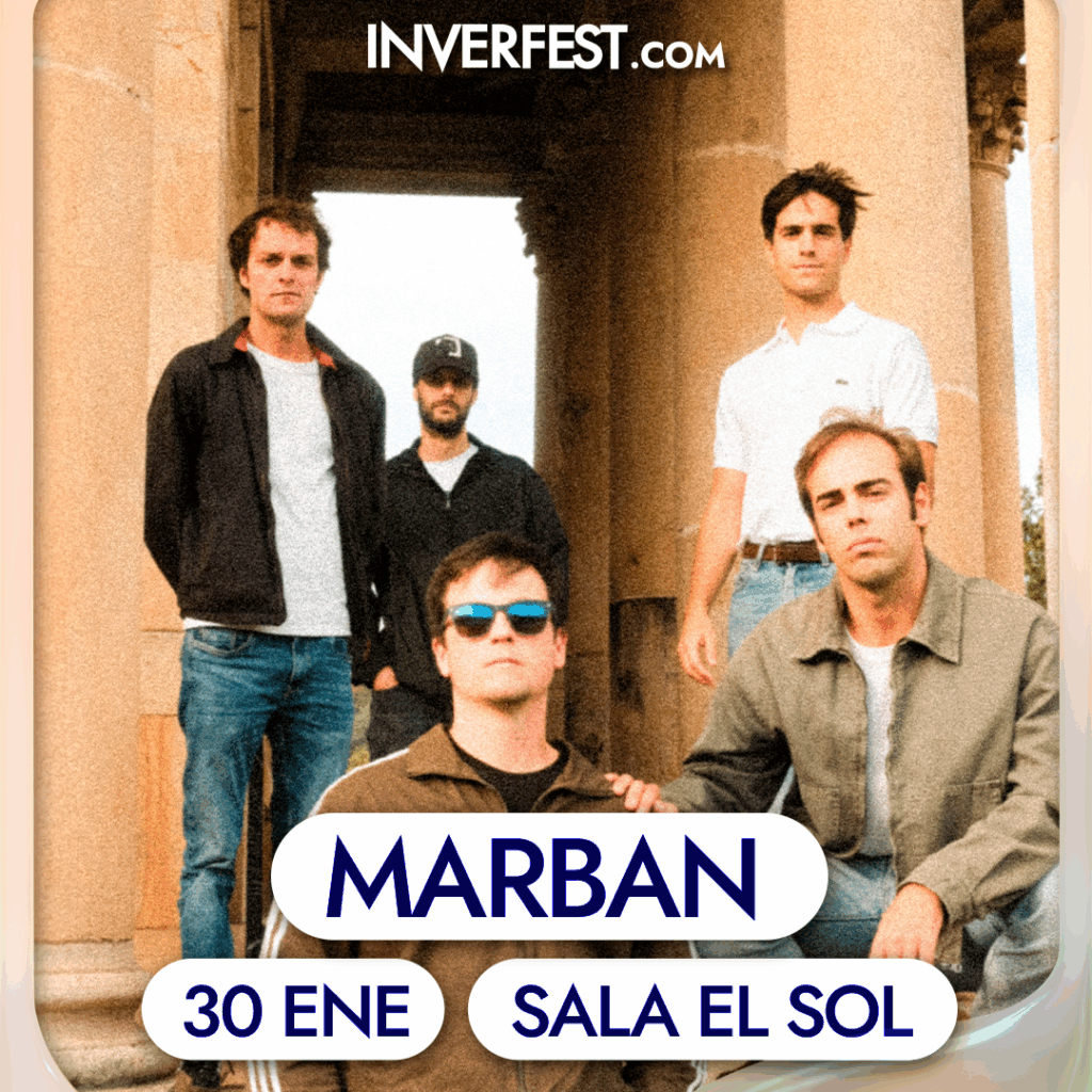 viernes 30 enero @ 21:00 – 23:30 – Marban, quinteto vasco, mezcla post-punk, influencias góticas y barrocas. Desdesus inicios, la banda explora la nostalgia, el dolor y la introspección, creando ununiverso conceptual lleno de símbolos clásicos y emociones profundas. Concolaboracionescomo McEnroe y La Bien Querida, reinventan su sonidomanteniendo intimidad, emoción y fuerza en directo.