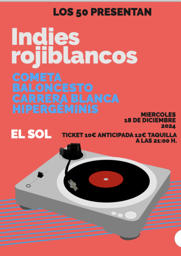 miércoles 18 diciembre @ 20:30 – 22:30 – La peña atlética Los 50 celebran su aniversario con una velada especial en rojo y blanco. Participan cuatro de las bandas jóvenes más pujantes de Madrid: Cometa, Carrera Blanca, Hipergéminis y Baloncesto. COMETA https://www.youtube.com/watch?v=wuXRc66Uuf8 CARRERA BLANCA https://youtube.com/watch?v=vW9tqnm8PQs HIPERGÉMINIS https://www.youtube.com/watch?v=xrhUe5s8qCQ BALONCESTO https://www.youtube.com/watch?v=VaG-gXELPHU