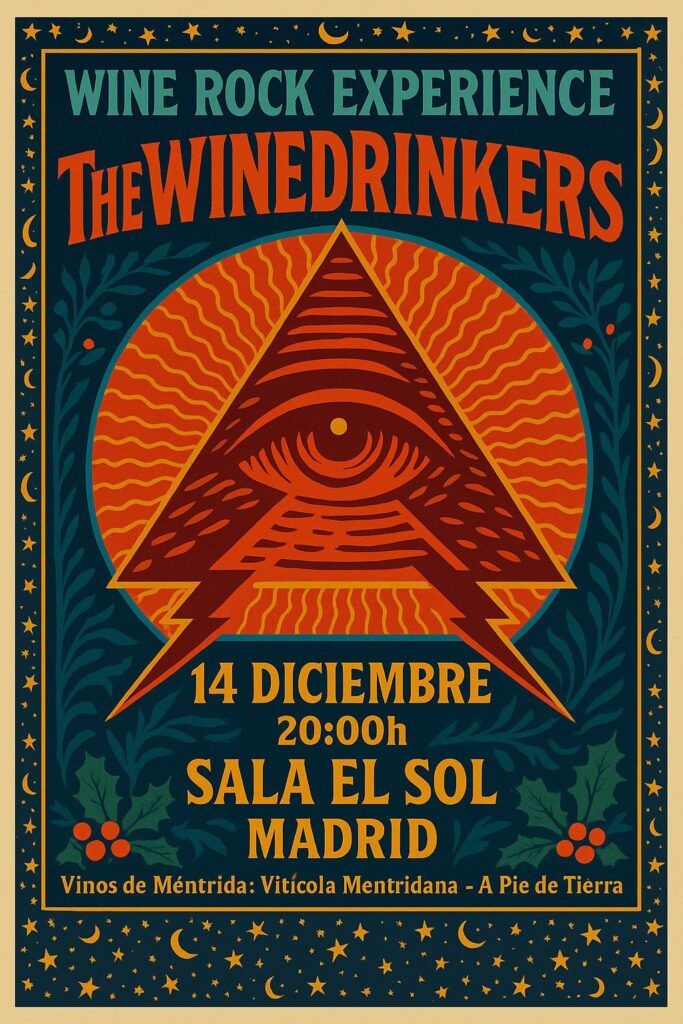domingo 14 diciembre @ 20:00 – 22:30 – The WINEDRINKERS en Madrid Rock and Wine de alta vibración. La entrada da derecho a una copa de vino de la zona de Méntrida de las bodegas: Vitícola Mentridana y A Pie de Tierra. Apertura de puertas: 20:00 h. Concierto 20:30h.