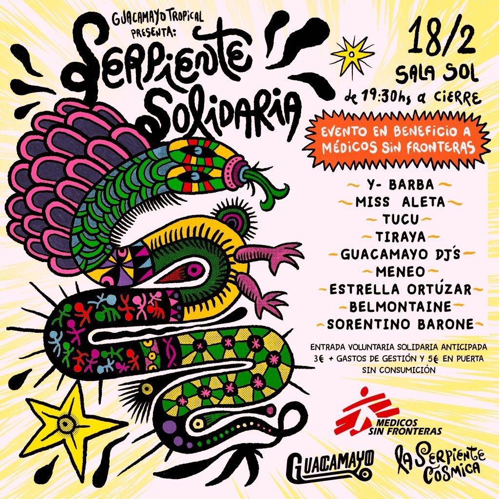 GUACAMAYO PRESENTA: SERPIENTE CÓSMICA SOLIDARIA en beneficio de Médicos sin Fronteras: Miss Aleta + Y-Barra + Guacamayo Tropical + Tiraya + Tucu + Sorentino Barone + Meneoh + Estrella Ortúzar